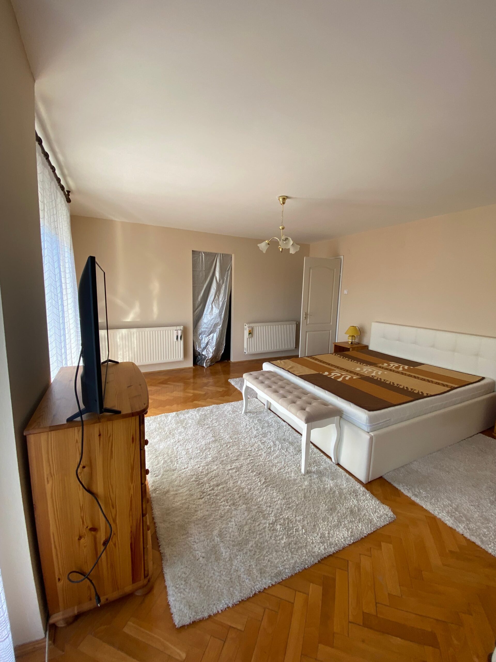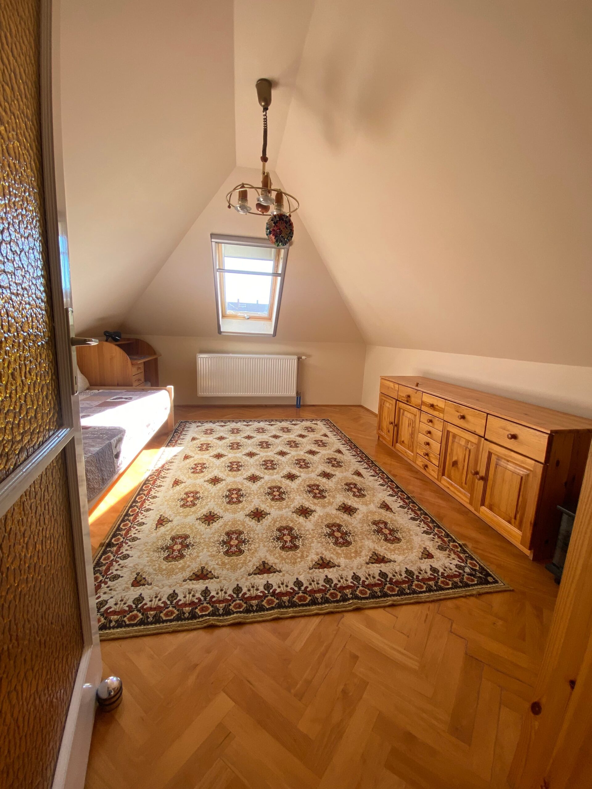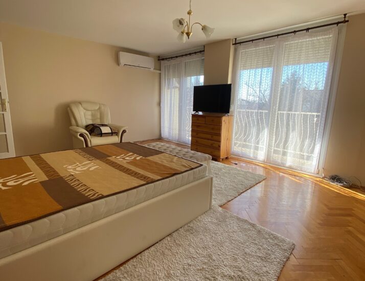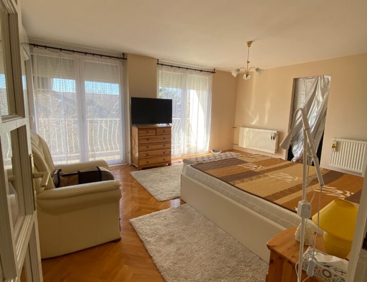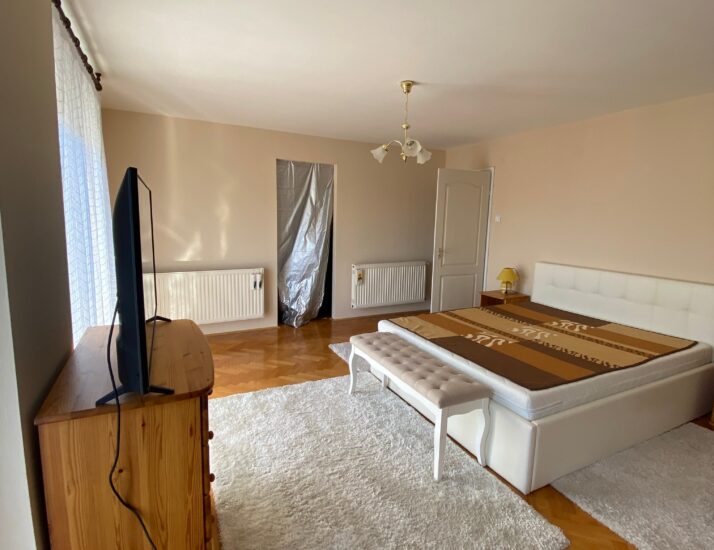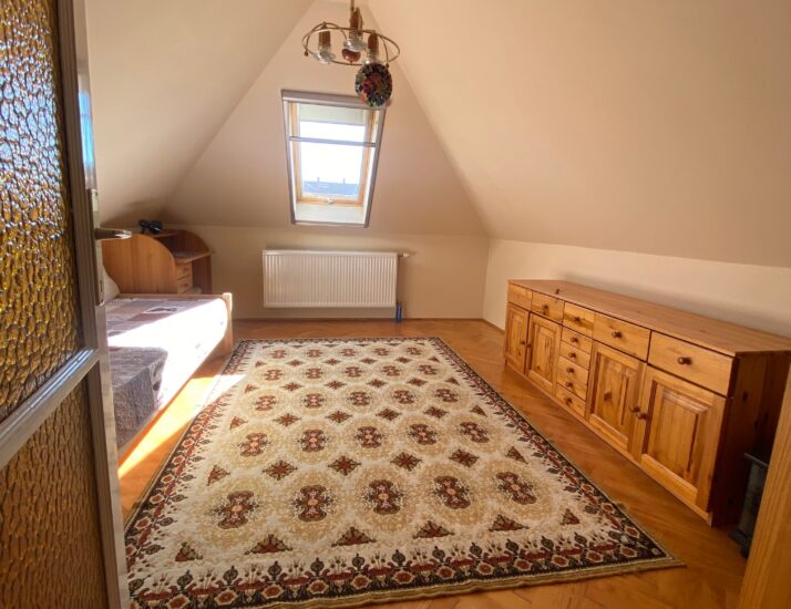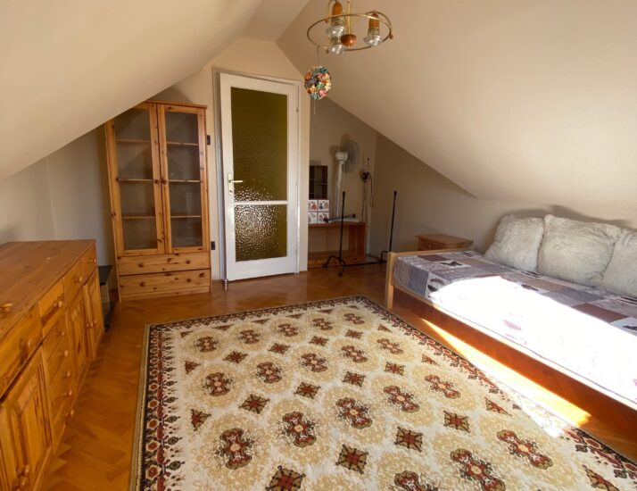 Az emeleti előszobából nyílik a tágas, erkélykapcsolatos fő hálószoba, amely gardróbbal is rendelkezik, így valódi privát lakrészként funkcionál. Emellett két további szoba, egy kádas fürdőszoba és külön WC szolgálja a család kényelmét.