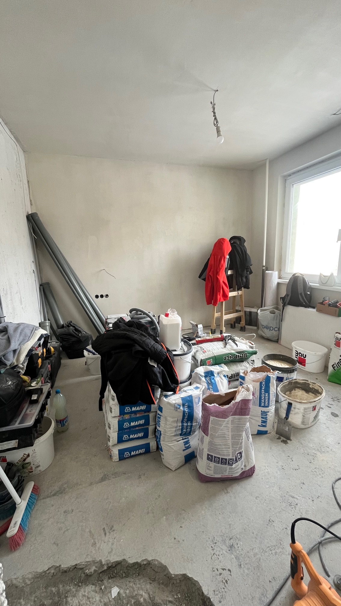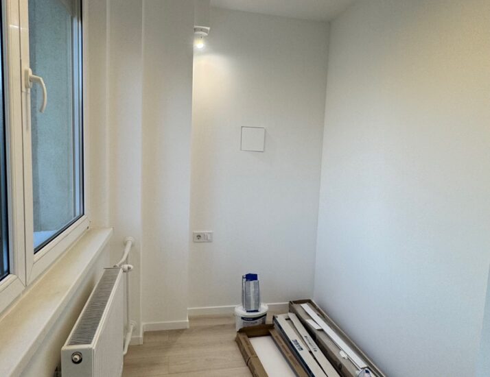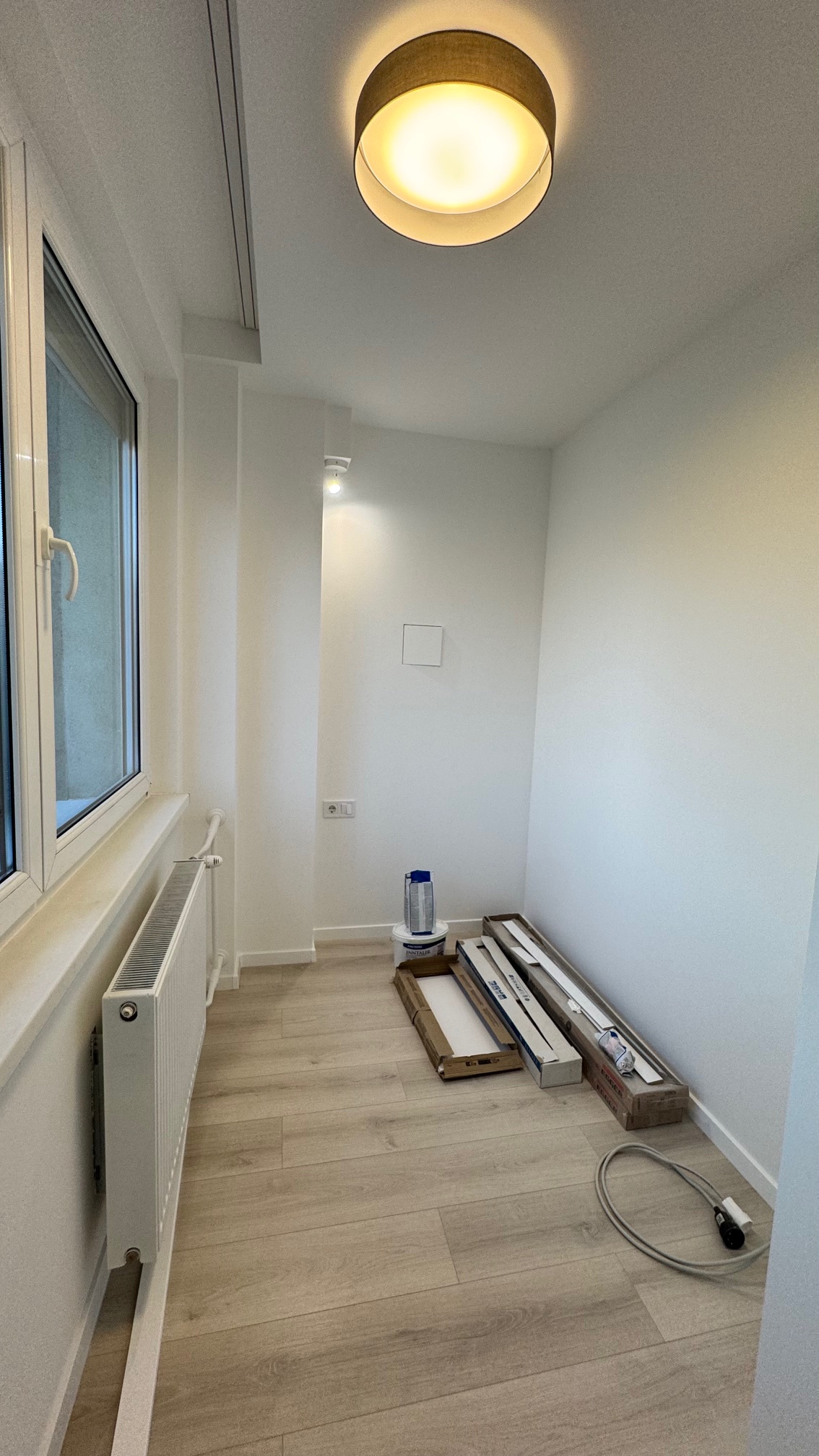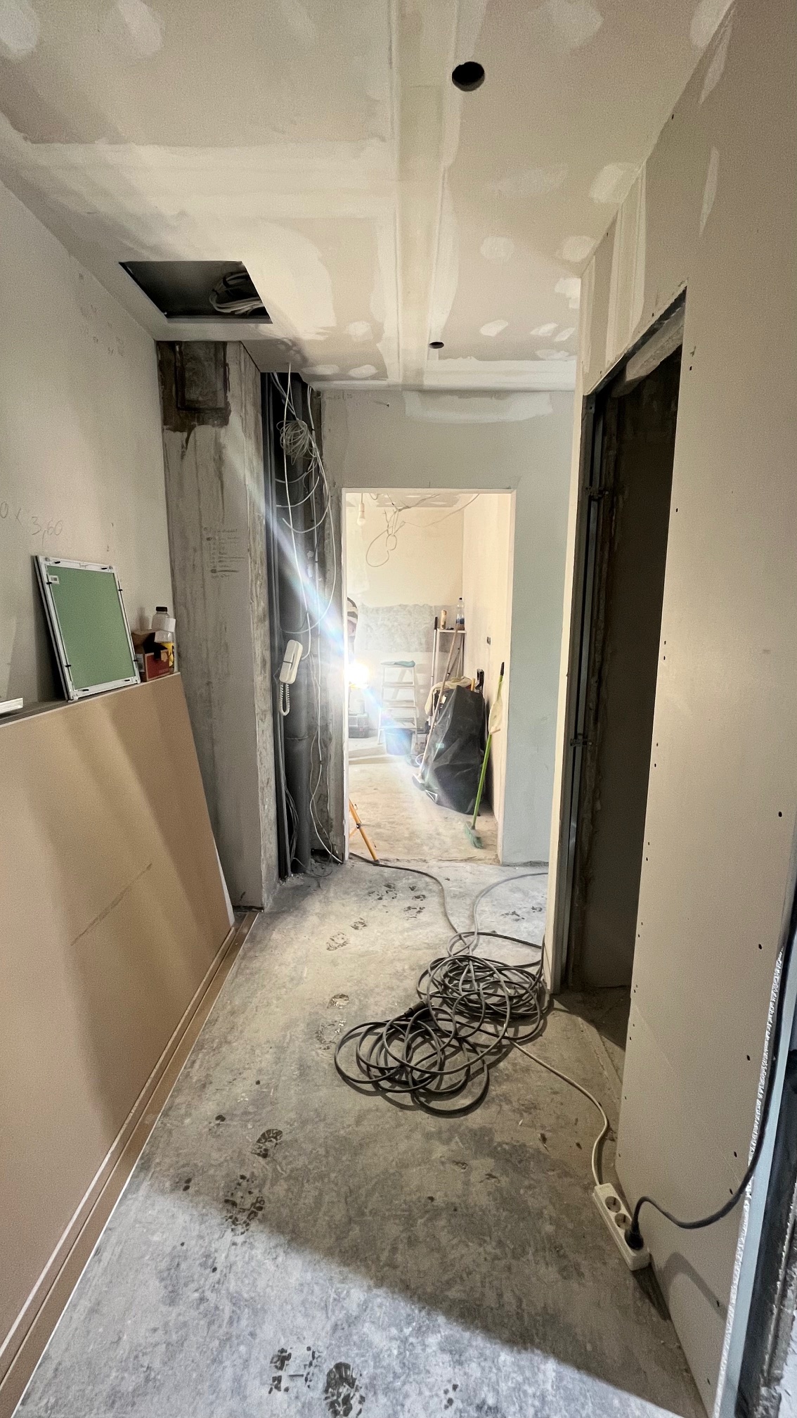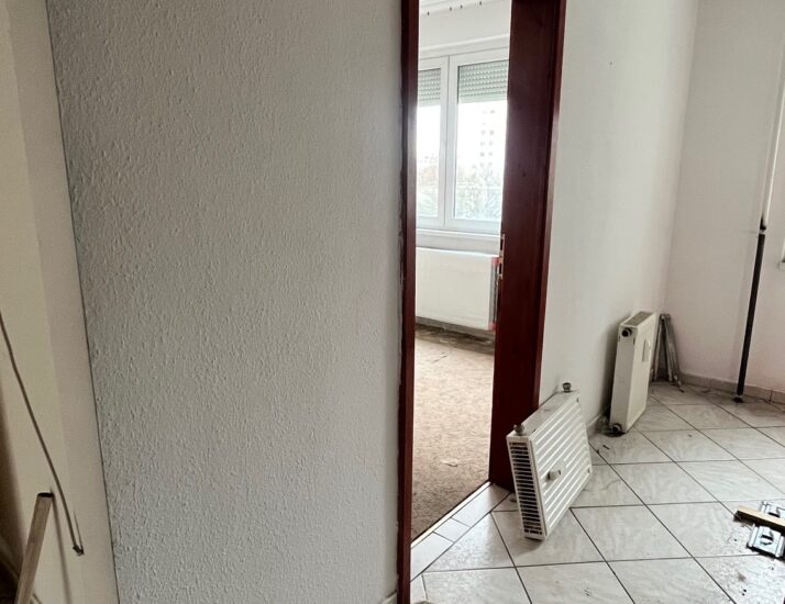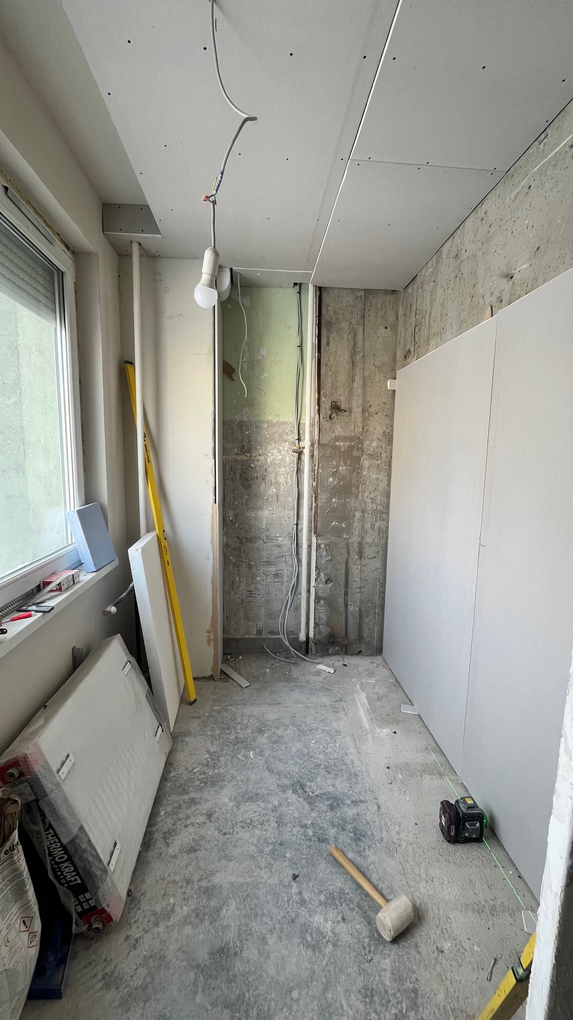 A felújítás valóban az alapoktól kezdődött. A régi burkolatok, falak és elavult vezetékek eltávolítása után a lakás szinte szerkezetkész állapotig visszabontva várta az újjáépítést. Teljesen új elektromos hálózat került kiépítésre 32 amperes teljesítménybővítéssel, így a nagyobb energiaigényű háztartási gépek egyidejű működtetése sem jelent problémát. A gépészeti rendszer is teljes korszerűsítésen esett át, a strang cseréjével együtt, ami hosszú távon is biztonságos és megbízható működést garantál.