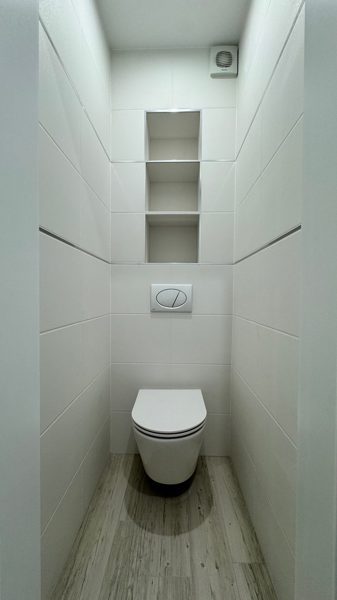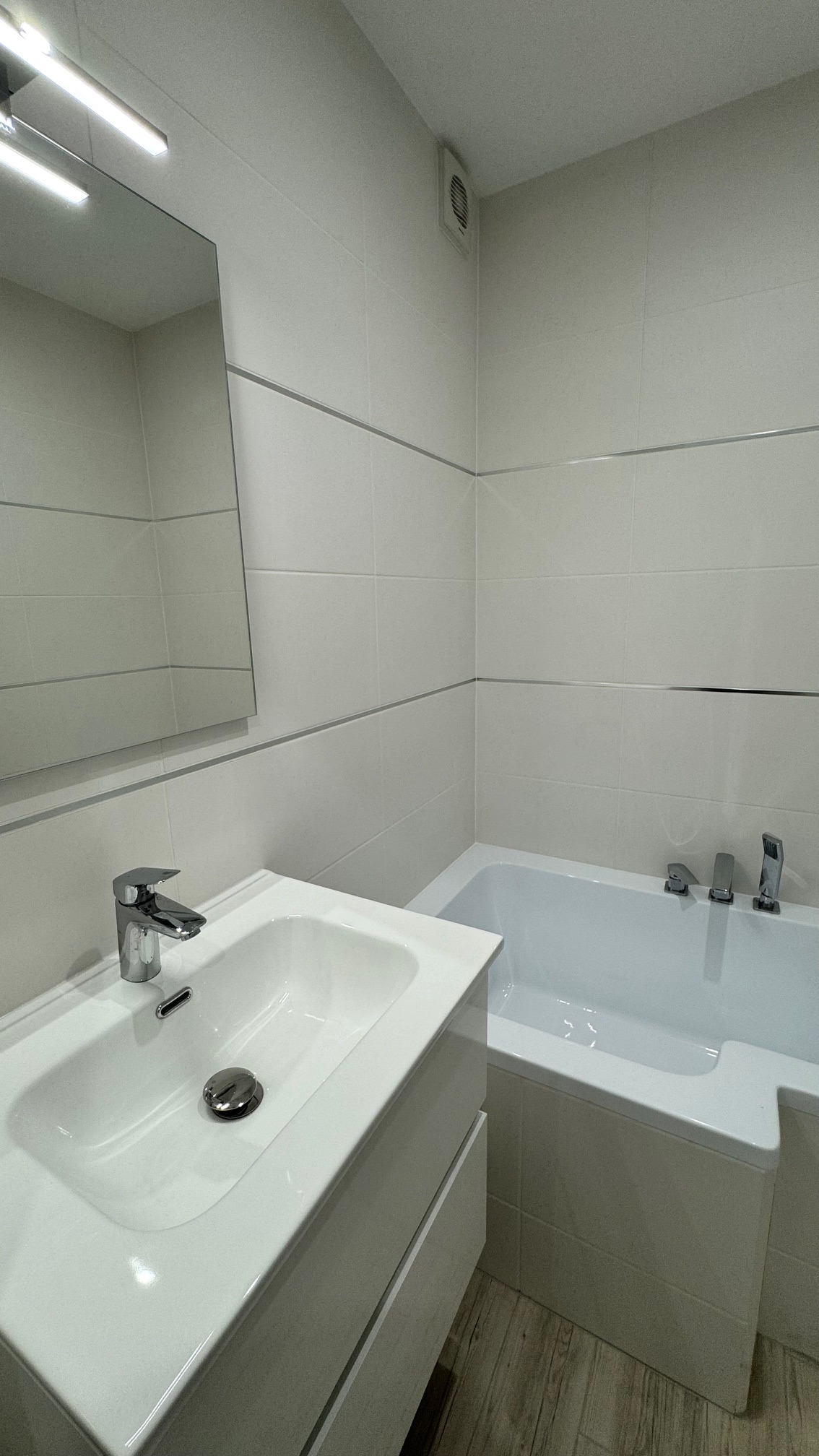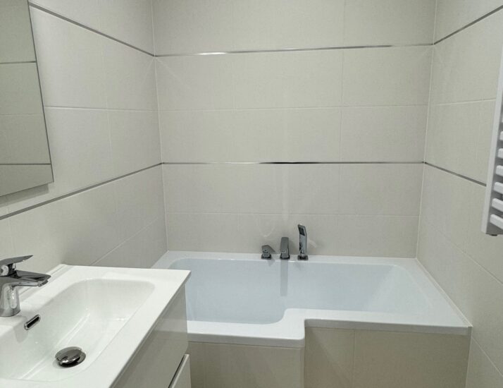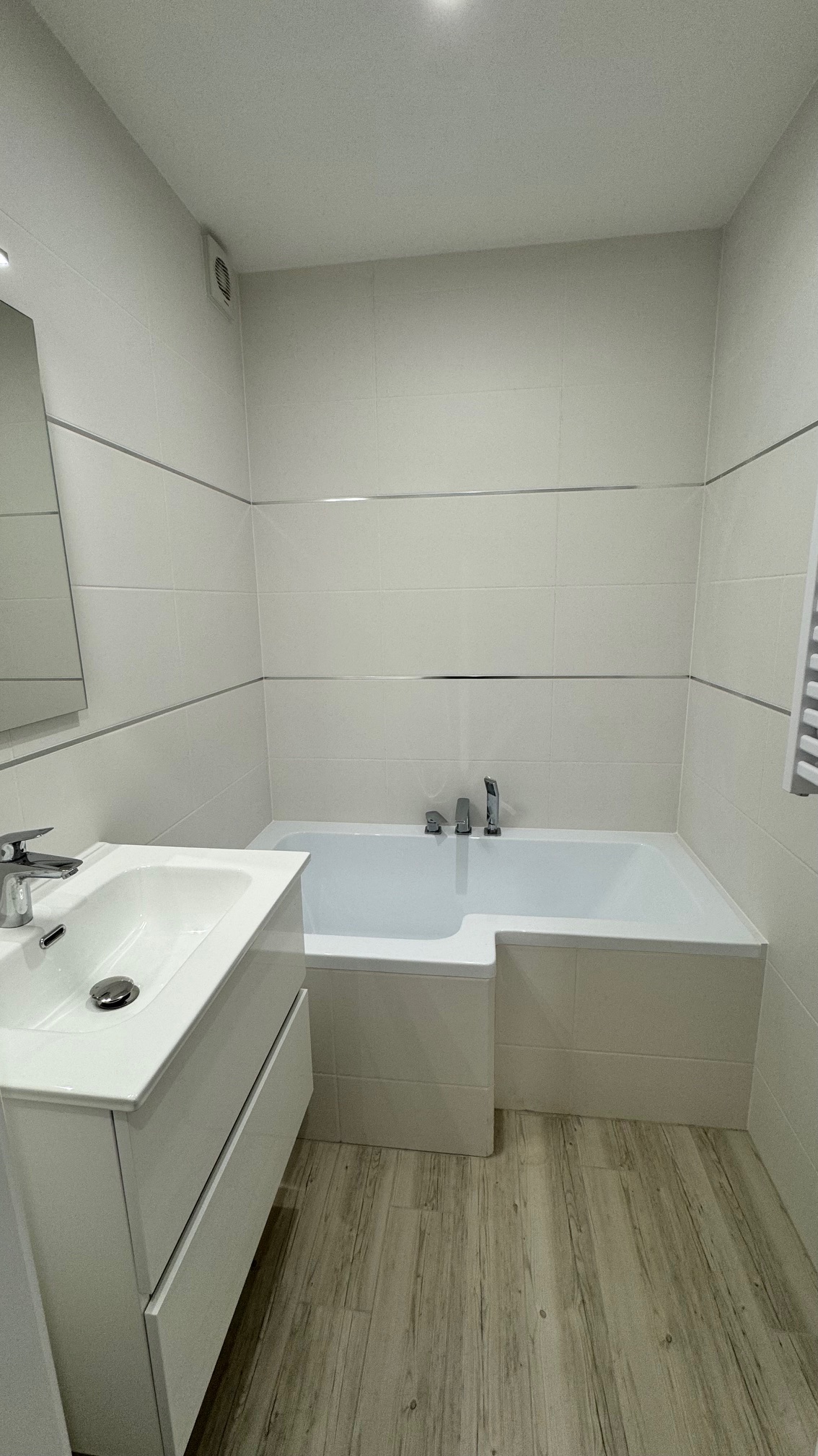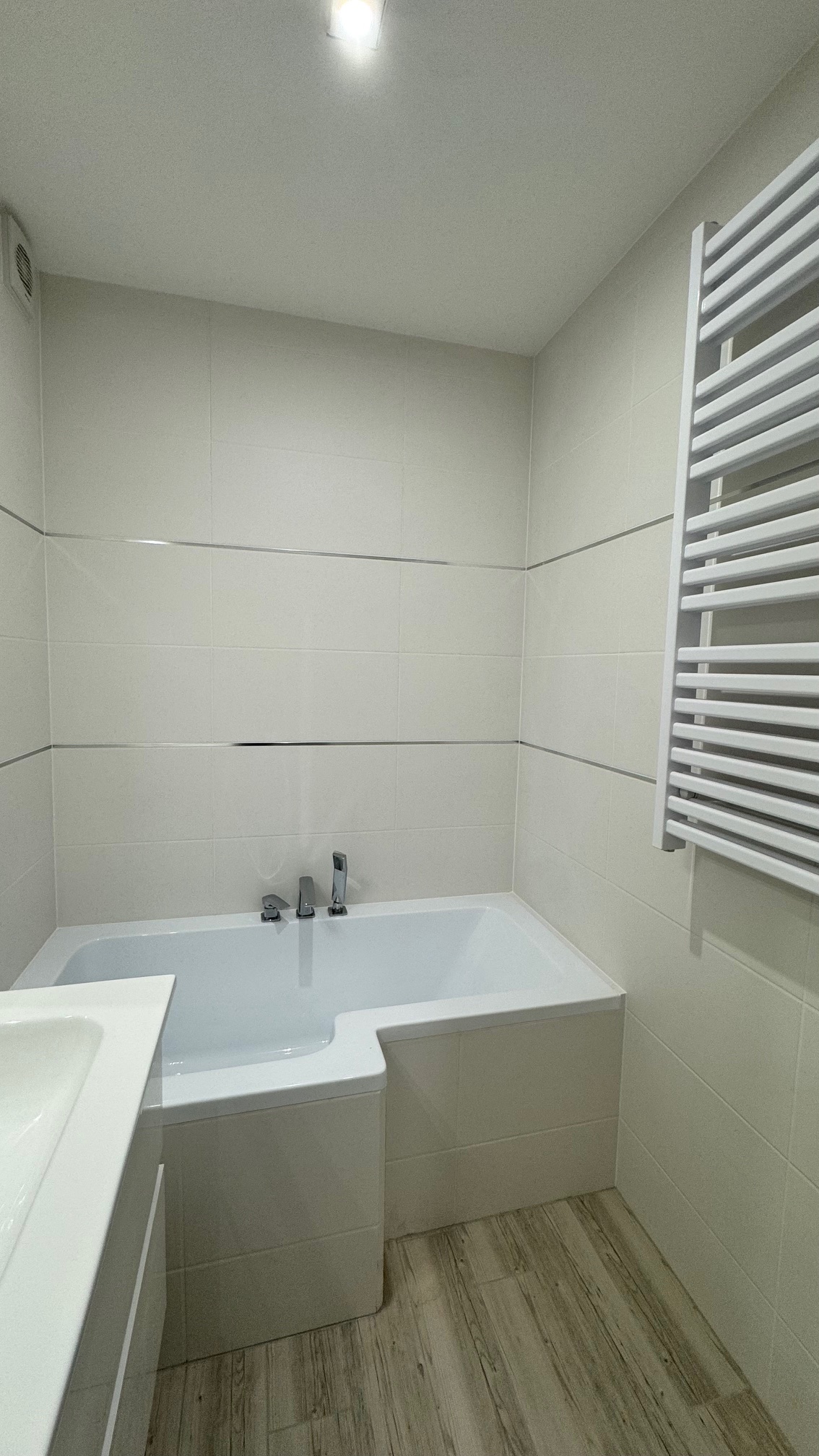 A fürdőszoba letisztult, modern megjelenést kapott minőségi burkolatokkal, új szaniterekkel és elektromos törölközőszárító radiátorral, amely a hidegebb napokon is kellemes hőérzetet biztosít.